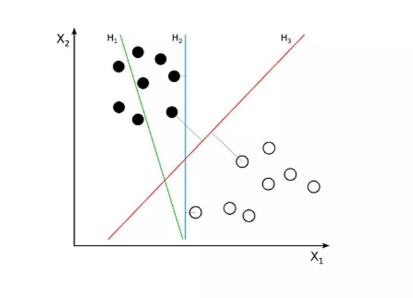 例如,H1 没有将这两个类分开。但 H2 有,不过只有很小的边距。而 H3 以最大的边距将它们分开了。