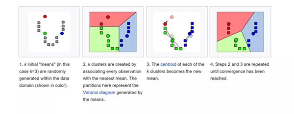 该算法根据每个数据点的特征,将每个数据点迭代地分配给 K 个组中的一个组。它为每个 K- 聚类(称为质心)选择 K 个点。基于相似度,将新的数据点添加到具有最近质心的聚类中。这个过程一直持续到质心停止变化为止。