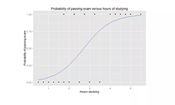 逻辑回归曲线图,显示了通过考试的概率与学习时间的关系。
